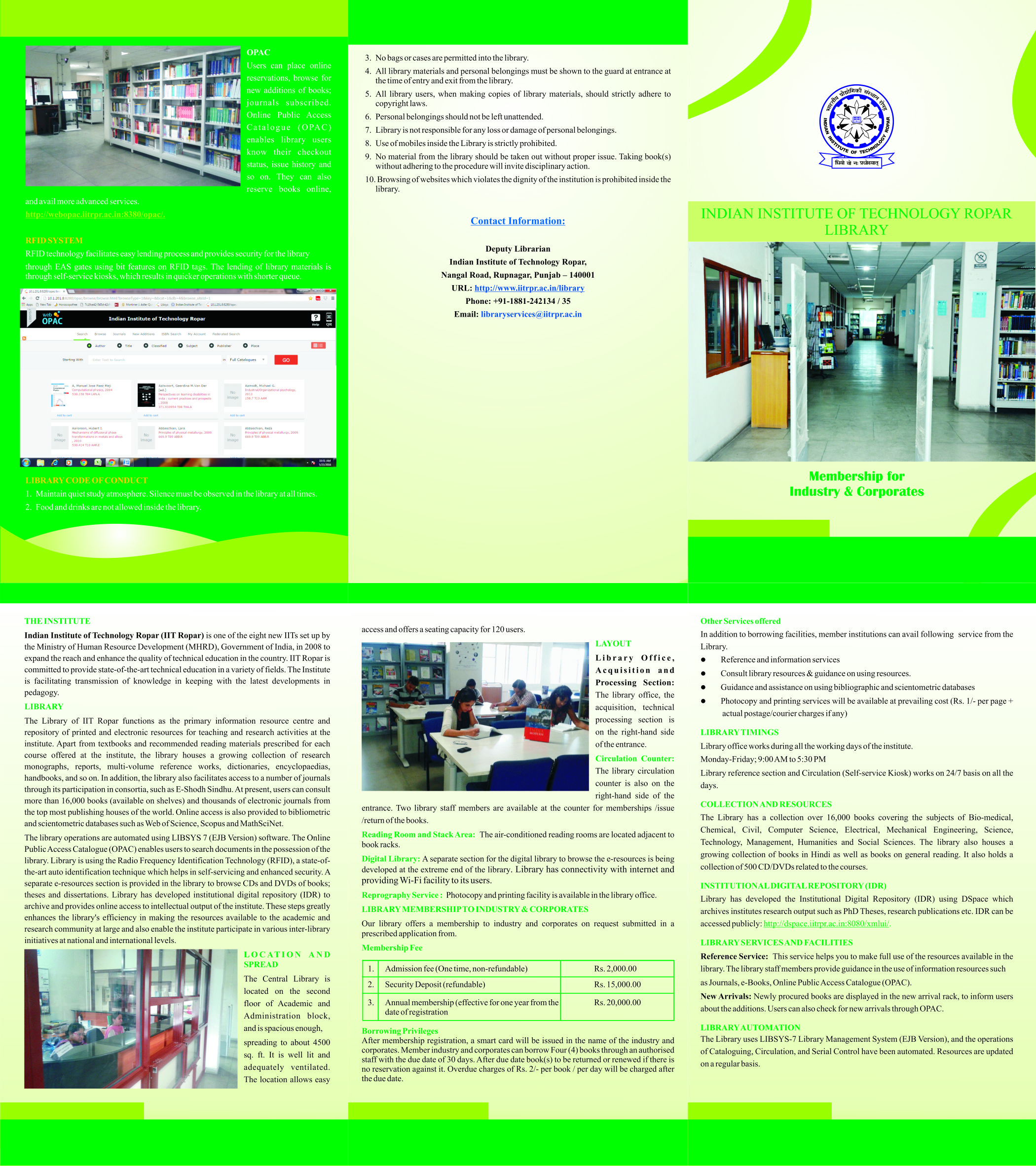As a new initiative to reach out wider community, we are extending our Library membership to Academic Institutions/Government Departments/Industry/Corporates, which are in and around Ropar. The individual Library membership is also open to Alumni's of IIT Ropar, Superannuated Faculty and Staff of IIT Ropar. Individual external Library memberships for Academicians, Researchers & Students is also available.